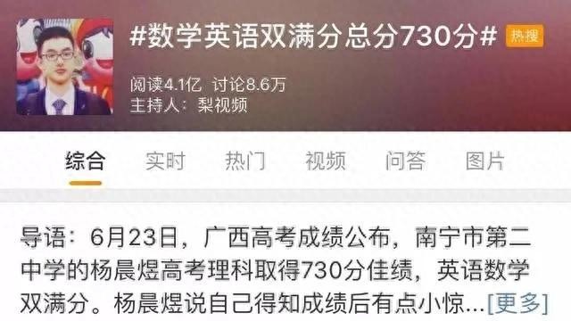 2023年的高考已经落幕,每一年的高考都备受瞩目,而当初2019年广西高考状元杨晨煜730分的高分得到全国关注焦点,直推微博热搜。
