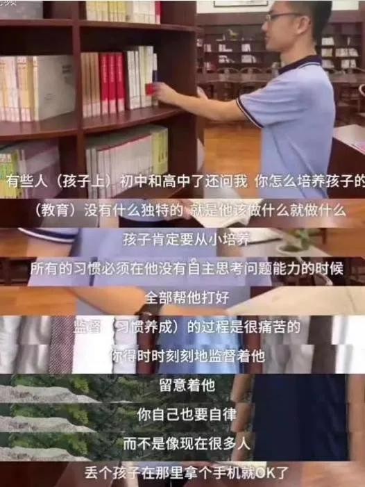 “很多人都问我怎么培养孩子,是我的培养方式没有什么独特的地方,就是小的时候,所有的习惯必须在他没有自主思考能力的时候,全部帮他打好,监督孩子的过程是很辛苦的,你得时时刻刻地监督着他,作为父母自己也要自律,而不是像现在很多人丢孩子在那里拿个手机就OK了。”