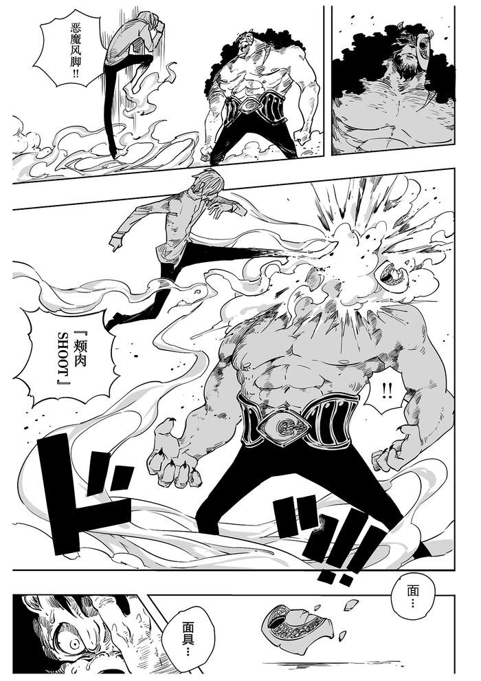 紧接着就是山治这一边了,在被敌人打中一拳后,山治也要展示出真正的实力了,恶魔风脚开启,一脚正面踢中凯厄斯的脸上。导致凯厄斯的面具碎了。。。