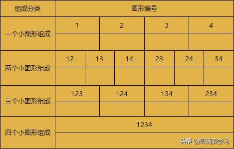 ②考虑这些编号的组合方法(注意是组合方法,非排列方法),同样需要分成一个小图形、两个小图形、三个小图形和四个小图形的情况讨论: