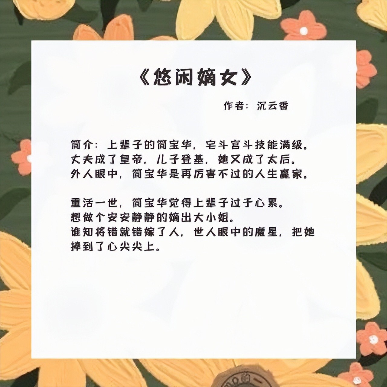 短书评:女主上辈子贵为太后,但费心费力也不讨好,过得也不开心。于是重生后,女主就努力改变,决意做一个悠闲贵女,好好享受人生。然后女主慢慢发现了自己上一世忽略的事情,比如原本以为温柔害羞的妹妹,竟是害她做了九皇子小妾的罪魁祸首。别的都是重生后怎么想办法报复原来对自己不好的人,这本女主一直很安安分分享受生活。做最多的就是看护家里一家身体平平安安,其他事也不多做,撞到自己面前了就处理掉。男主比女主大九岁。女主点拨了男主结果改变了命运,从此走上了和前世不一样的命运。男女主感觉是天造地设的一对,感情水到渠成