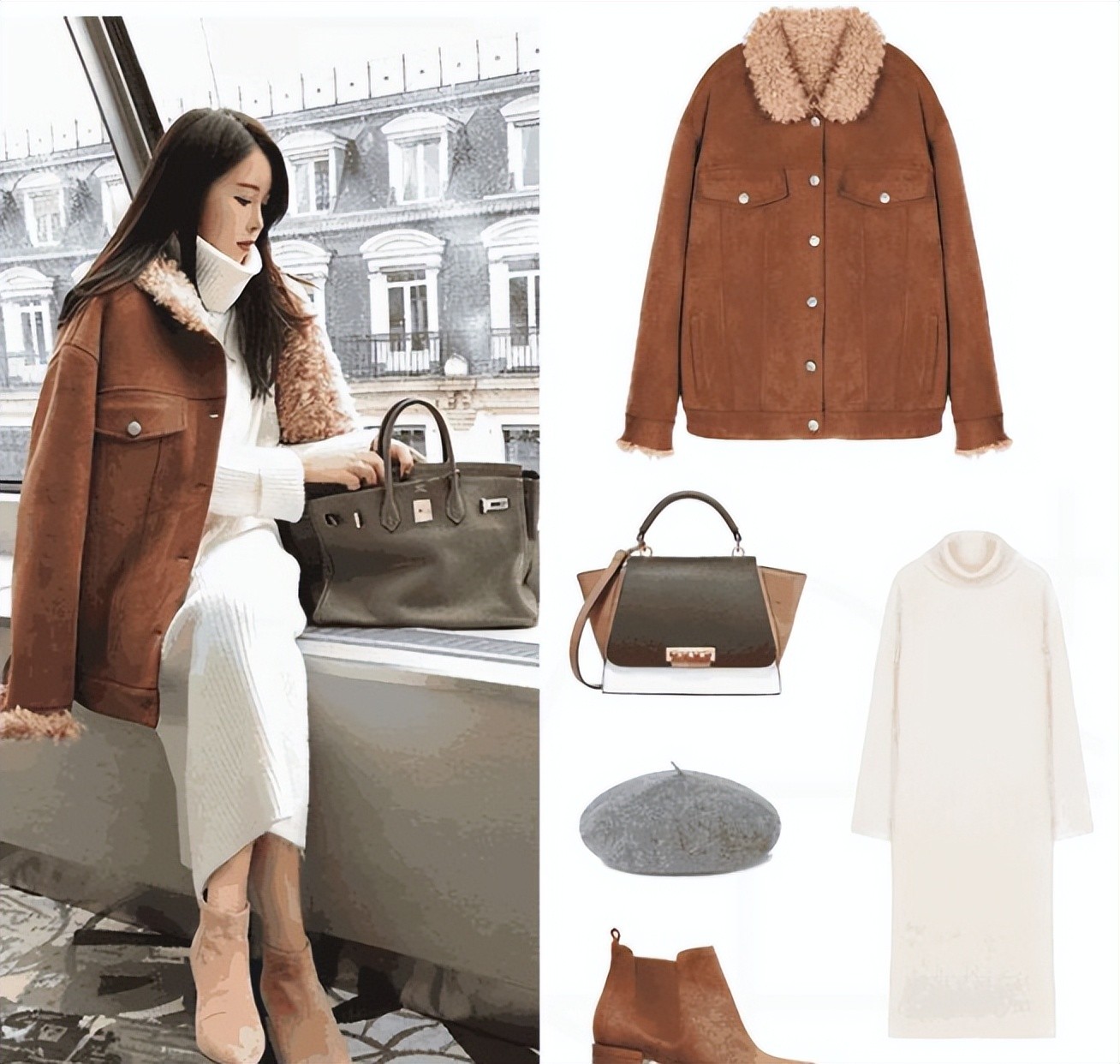 在长款毛衣裙外面套件短外套就是非常显高的穿法,大家还可以尽情发挥搭配功底,比如配皮衣、牛仔衣、西装等等。