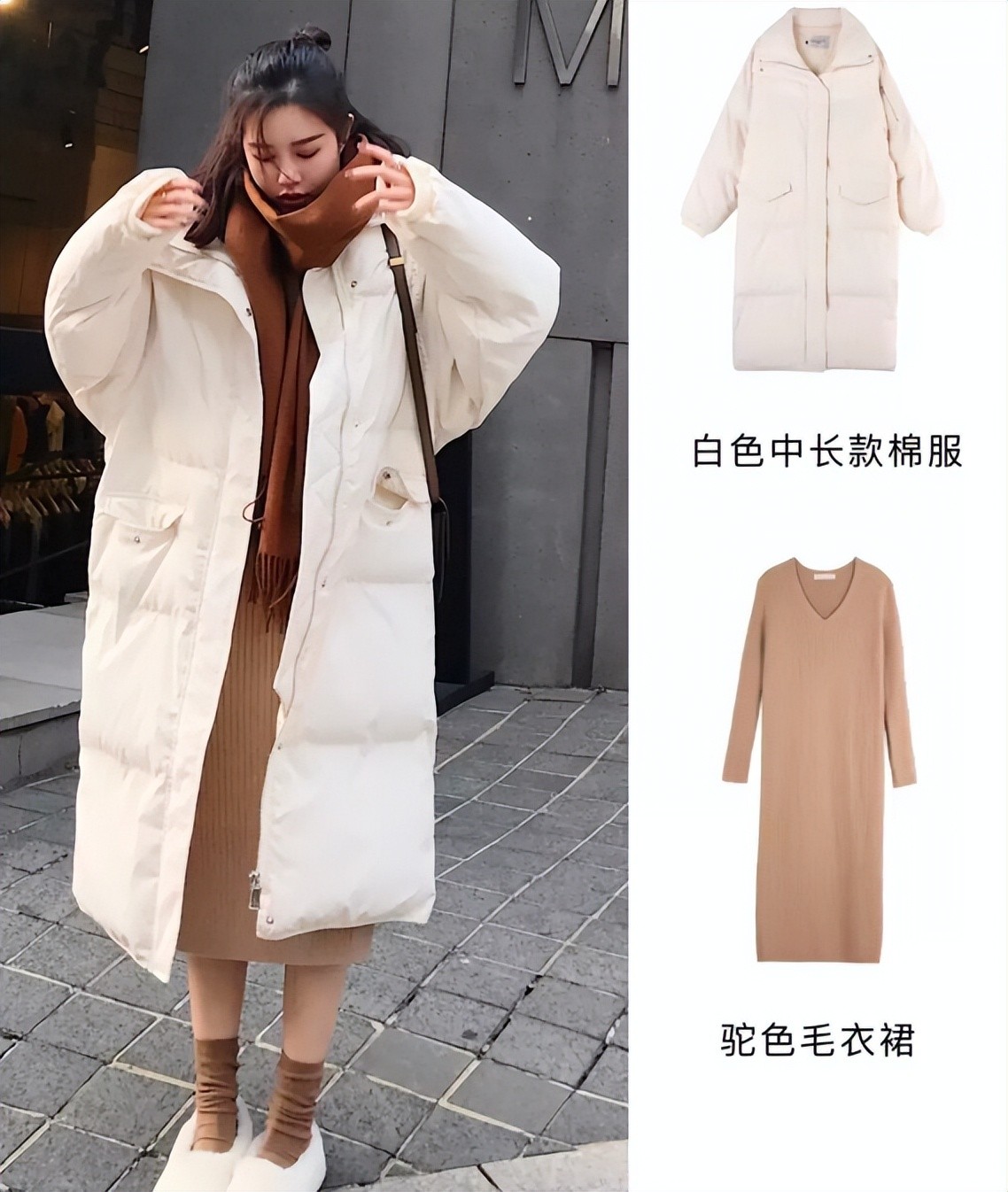 棉服搭配长款毛衣裙,是比较精约大方的一款冬装搭配,保暖亲肤作用很好,修身作用很赞,下摆长及脚踝处,轻松抵挡北风吹袭,外面穿一件棉服,加上大大的毛毛领,看起来更显温暖舒适。是青春感十足的选择,能够让整体造型更加时尚。