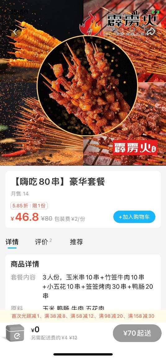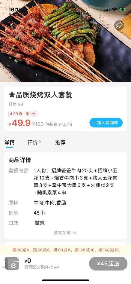 对于烧烤品类来说基本的套餐组合可以稍微简单一点,既可以是热销产品的组合,也可以是一个主要的产品搭配荤素来组合,基本套餐的核心还是减少顾客的选择,提升下单转化率。