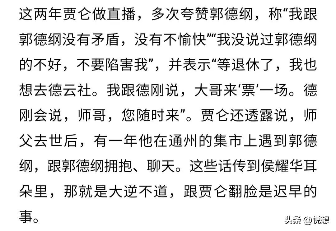 对此,不少网友猜测,侯耀华这番话,很可能是句气话,毕竟,侯耀文去世后,贾伦可是多次公开支持郭德纲,而侯耀华和郭德纲之间的恩怨,那可是人尽皆知