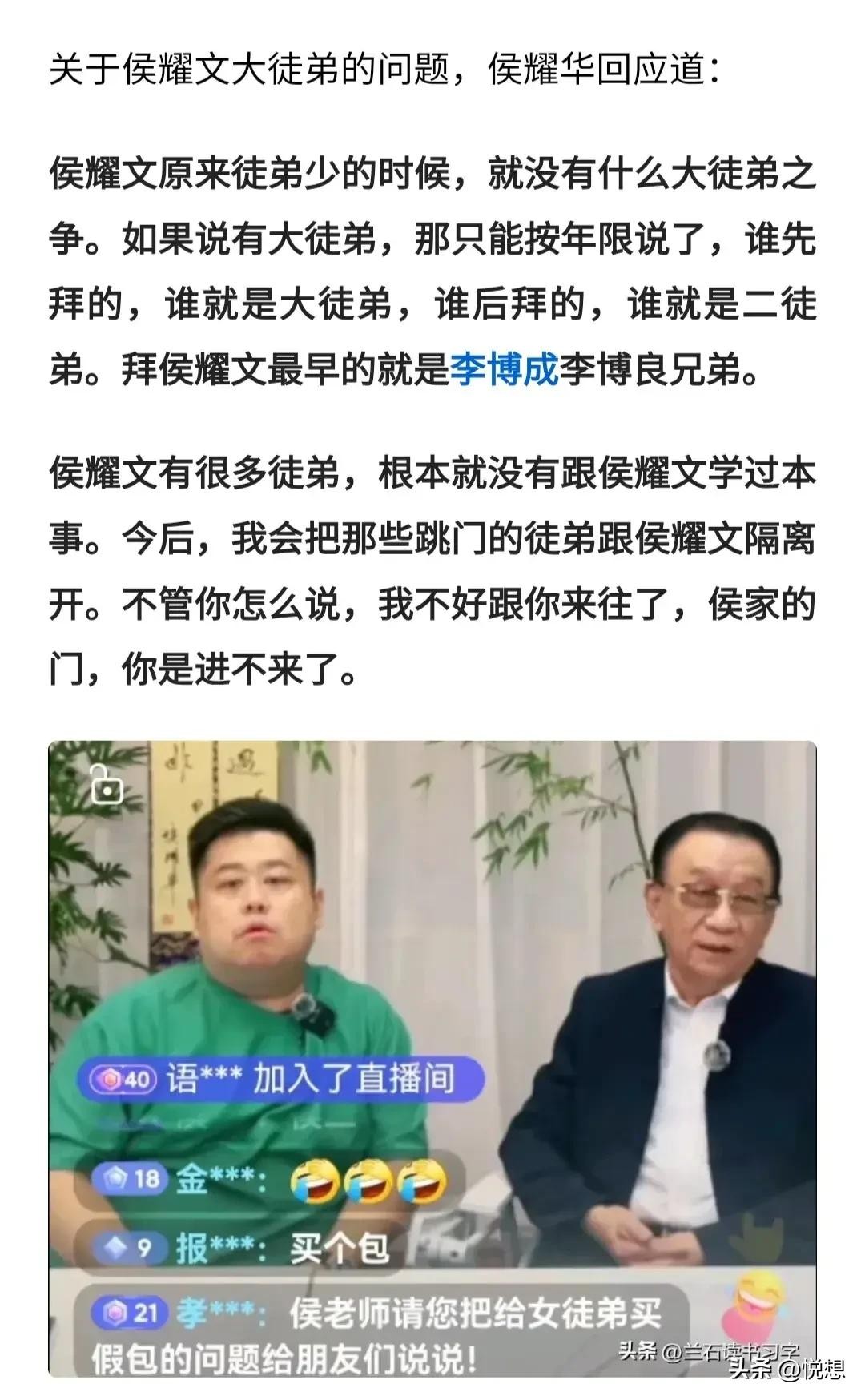 可偏偏就在前几天,侯耀文的亲哥哥侯耀华先生,在直播中公开表示,他不承认贾伦是侯耀文的大徒弟,在他看来,侯耀文的大徒弟另有其人,那就是李博良、李博成兄弟