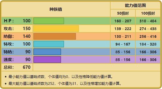 注:技能参照第七世代游戏技能表。技能里粗体字的招式为具有属性一致加成效果的招式。招式教学是可以通过招式教学习得。