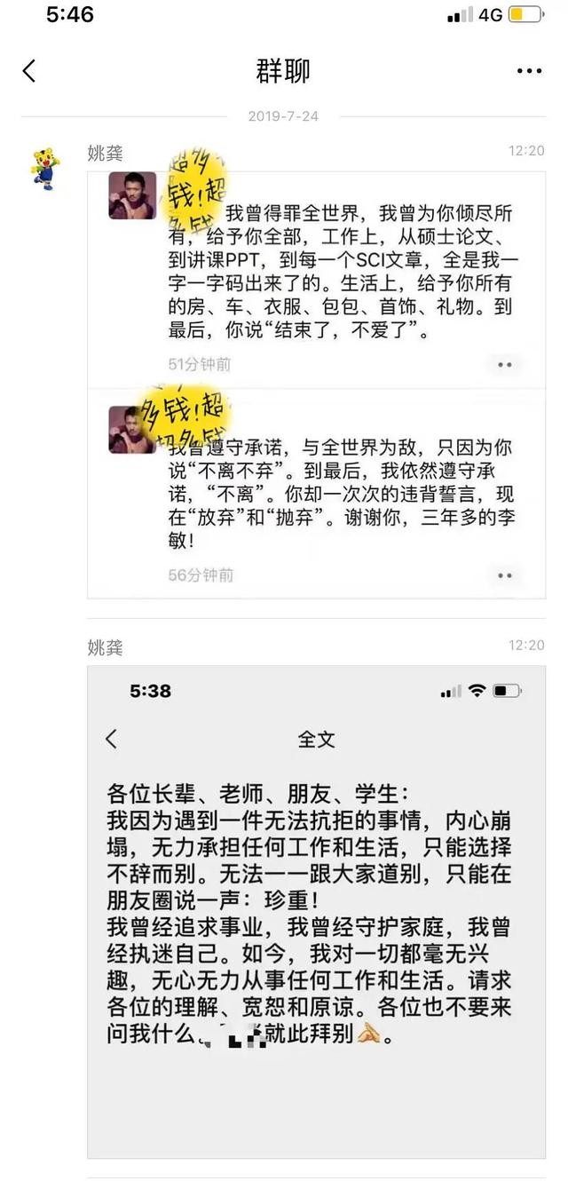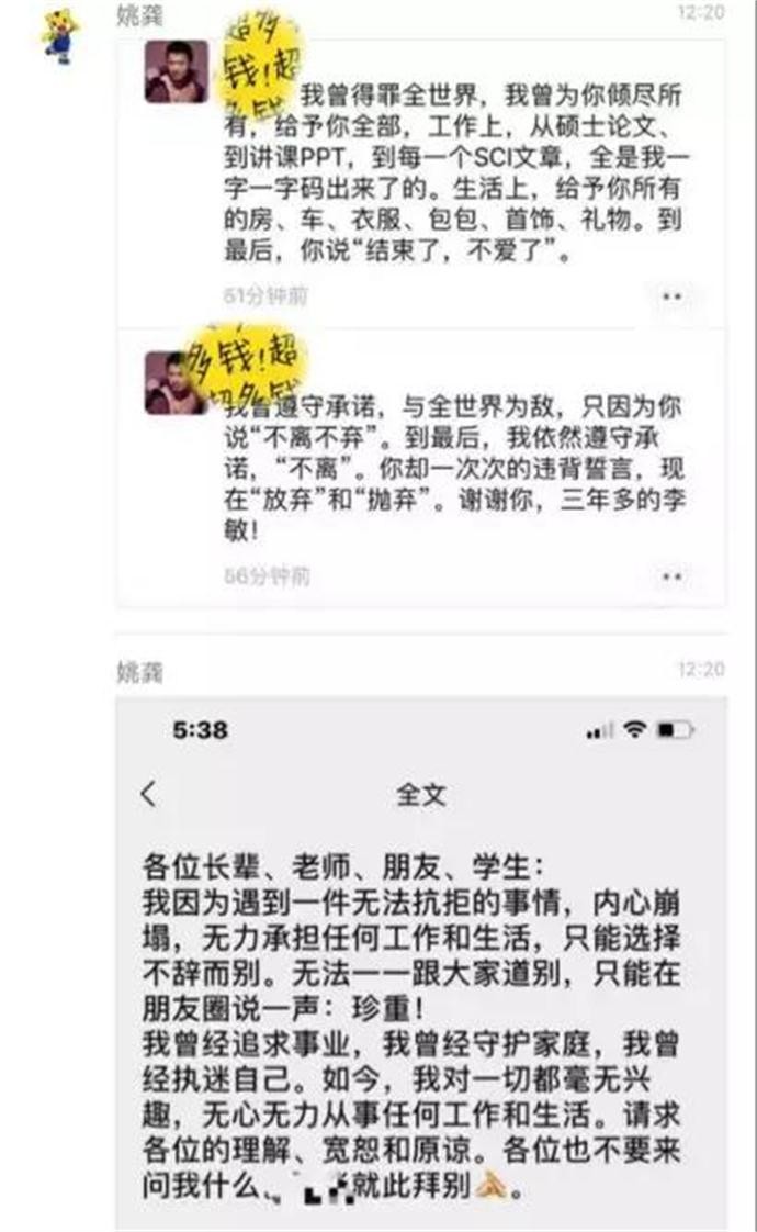 而从陆炎医生在朋友圈留下的“遗书”可以知道,他在作为指导老师指导李敏期间二人产生感情,为了李敏与他的爱情,他“大方出手”送了李敏五篇高分sci和一篇nature的论文,就连李敏硕士论文也是该陆炎自己写的,不仅如此在三年后当他为了李敏抛妻弃子后,却发现他只是小三的小四,受不了刺激吃了30片安眠药自杀。