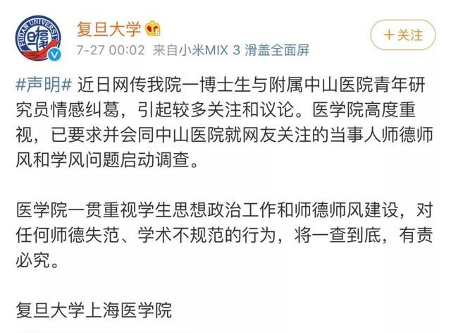 7月27日凌晨,@复旦大学 发微博回应此事:已要求并会同中山医院就网友关注的当事人师德师风和学风问题启动调查,将一查到底,有责必究。