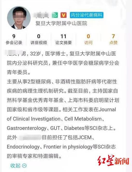 公开消息显示,陆某,男,32岁,医学博士,复旦大学附属中山医院内分泌科研究员,兼任中华医学会糖尿病学分会青年委员,主要从事2型糖尿病、非酒精性脂肪肝病等代谢性疾病的病理生理机制研究。截至目前,陆某主持国家自然科学基金优秀青年基金、上海市科委启明星计划国家级和省市级等课题。