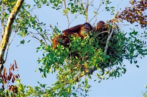 红毛猩猩是世界上体型最大的树栖动物。成年的雄性红毛猩猩体重可达150公斤以上,他们很少下地,一生大部分时间都待在树上,吃饭、睡觉都在树上。红毛猩猩每晚都会花上几分钟,精心编织树枝,搭建新巢穴,并用柔软的树叶当作枕头和毯子。