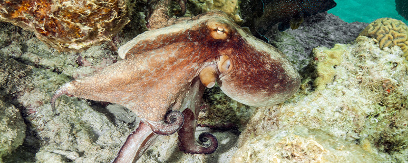 普通章鱼,属于八腕目、章鱼科、章鱼属的海洋动物。身体大约长60厘米,触手的长度约是躯体的3倍,躯体是可以自由伸缩的。身体表面有很多疣,全身分布皮肤色素细胞,体色和身体长度可以根据周围环境变换,在岩石和海藻中会表现出很好的拟态。