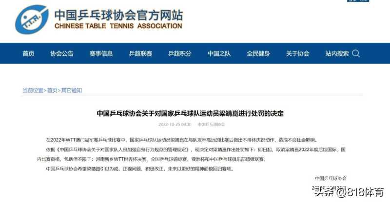 10月25日,中国乒协官网发文:“中国乒乓球协会关于对国家乒乓球队运动员梁靖崑进行处罚的决定”