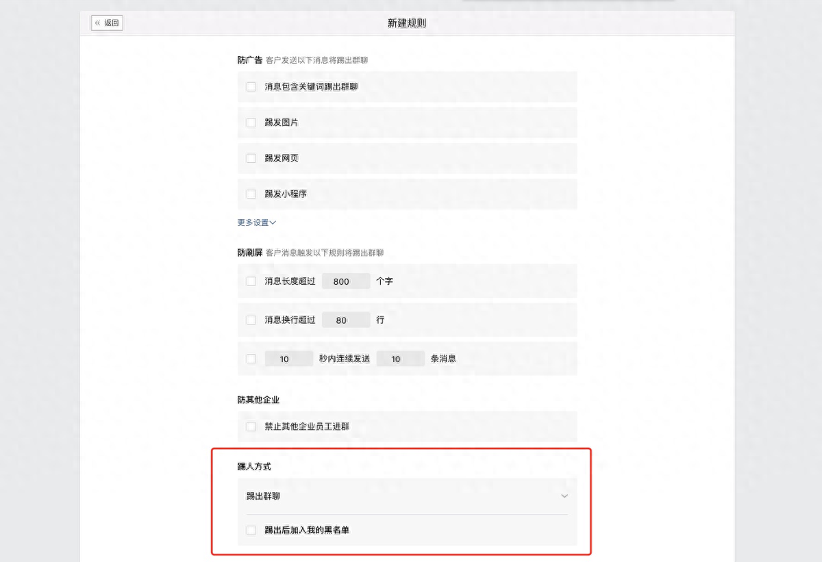 群管理机器人,自动踢出群内打广告、刷屏的客户,并将客户添加进群黑名单,无需员工时刻关注群聊。同样也是管理员在企业微信管理后台的「客户联系」、「安全管控」、「防骚扰」中统一进行配置,再由群主在群聊中开启。
