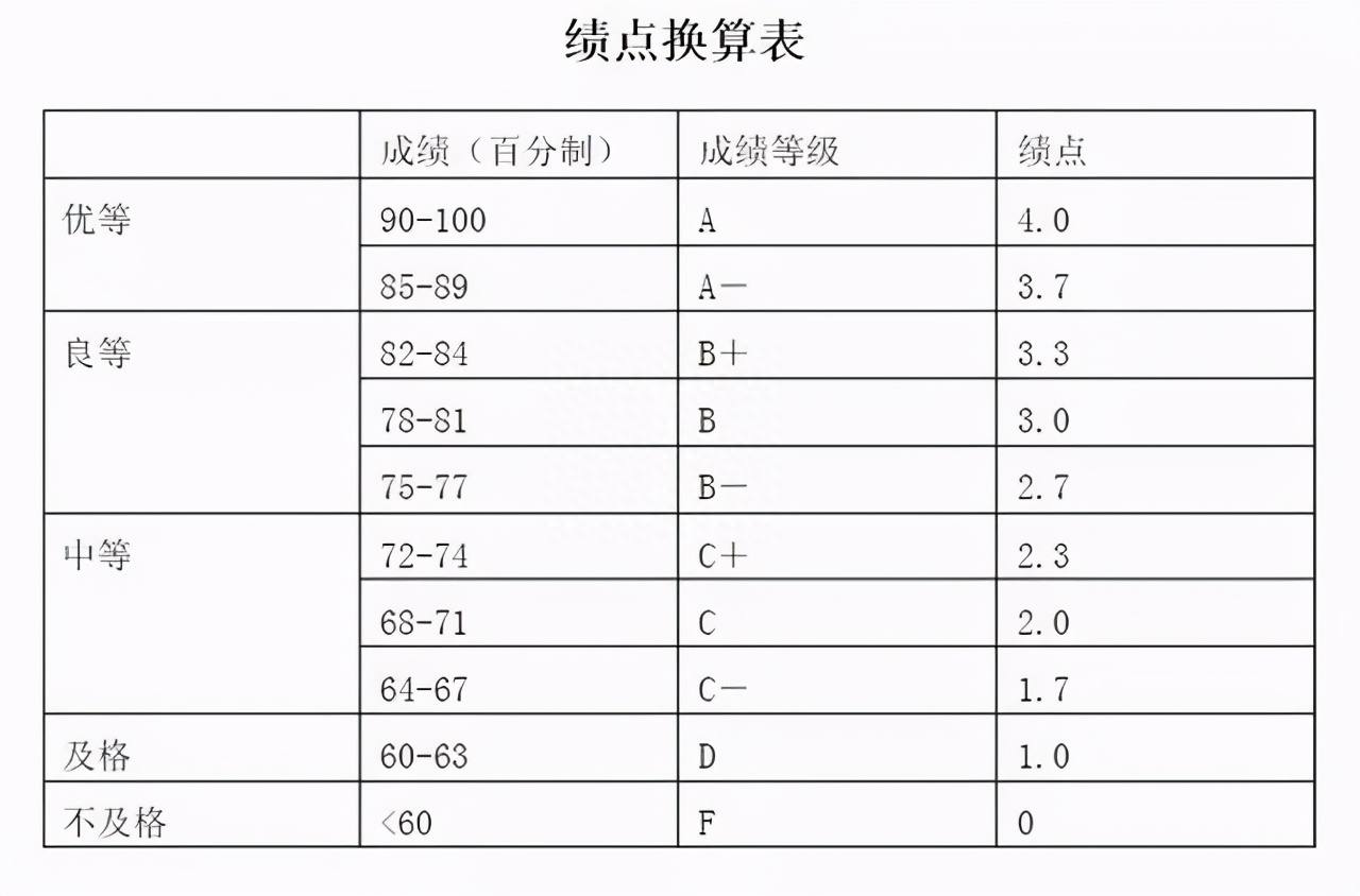 一般来说,满绩点是4.0(也有5.0),其与成绩的对照表如下图所示。