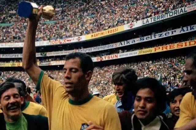 1970年墨西哥世界杯,夺冠的巴西队队长阿尔贝托高举雷米特杯