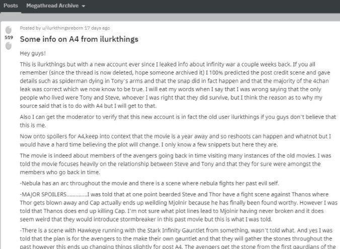 2017年11月,一位匿名用户在4chan上发帖,泄露了《复仇者联盟3:无限战争》和《复仇者联盟4》的大部分剧情。后来的事实证明,他泄露出来的无限战争内容是正确的:包括红骷髅的出场和灭霸为获得灵魂宝石牺牲了卡魔拉,以及蜘蛛侠彼得·帕克死在托尼·斯塔克身边的情形。考虑到这个事实,我们认为,他对《复仇者联盟4》的泄露也是正确的。