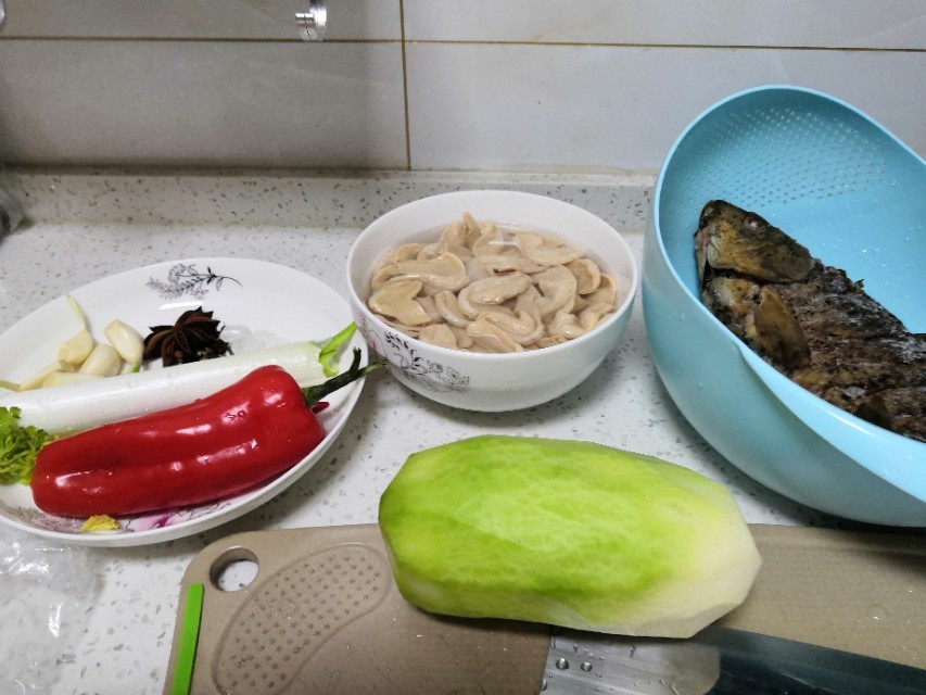 主要的原料有:鲤鱼1条,萝卜1个,葱蒜适量,生抽10克,老抽10克,盐3克,八角1个花椒10粒,冰糖6小粒,人造肉50克,红辣椒1个,尖辣椒1个,面粉100克,,玉米面50。做法如下: