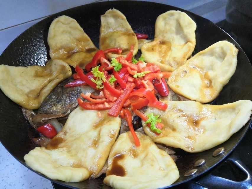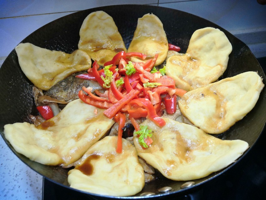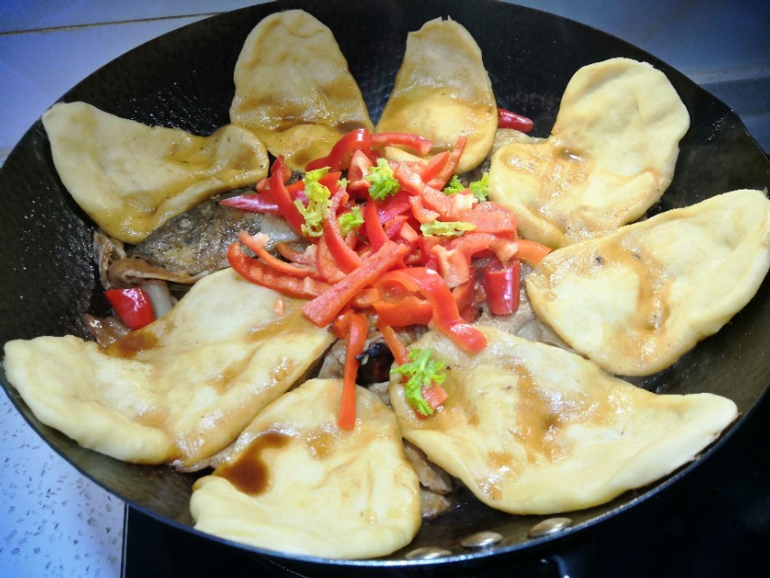 第八:鱼炖半个小时后,把面剂子捏成小饼子贴在锅边上,再炖半个小时