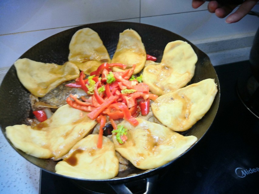 第九:半个小时后,小饼子烤焦微黄说明小饼子熟了,地锅鱼就好了。这样做的地锅鱼,饼香鱼鲜,滋味鲜美。
