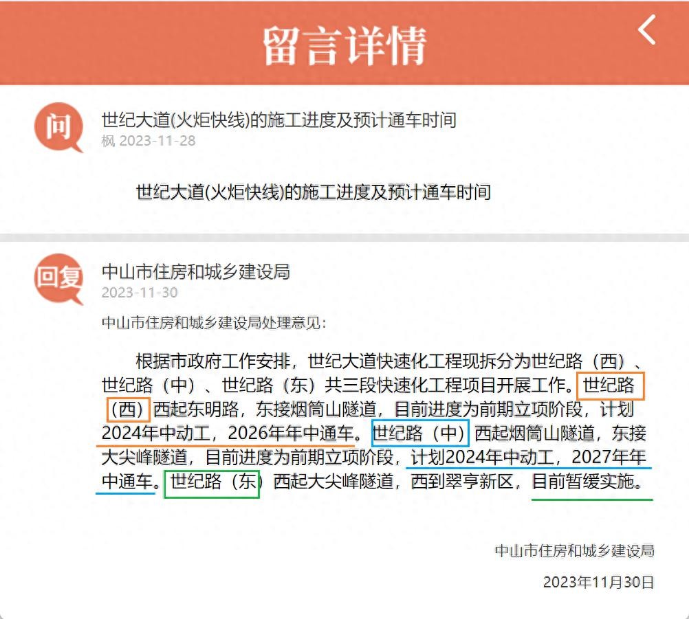 近日,一位市民在“问政中山”留言板上就世纪大道(火炬快线)的施工进度及通车时间进行了咨询。中山住建局对此作出了详细答复,并透露了工程的最新计划和进展。