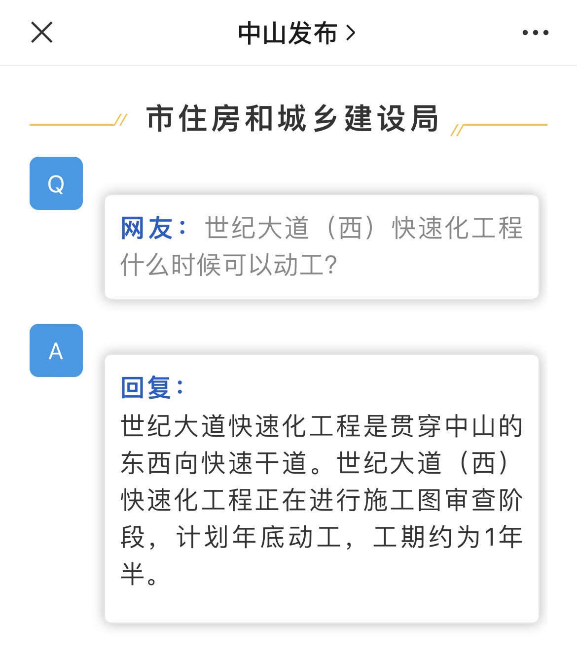 在8月份的市民提问回复中,中山市住建局透露世纪大道(西)快速化工程正在进行施工图审查阶段,计划于年底动工,工程预计历时1年半。