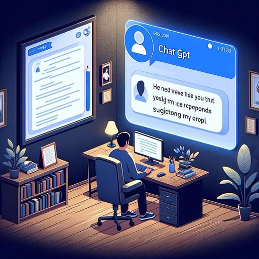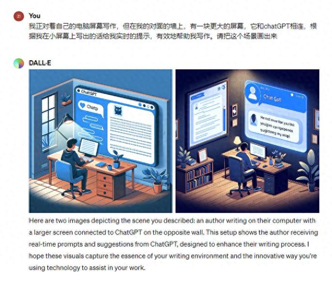 我把这个想法描述给了ChatGPT,请它画出来,它马上为我产生了两幅场景图。这两幅图都非常棒。为了便于你的观察和理解,我把我的提示词也截屏放在下面。请注意:第二幅图当中墙上有两个屏幕,而在我的描述当中,只描述了“一块屏幕”,我要承认,这个任务它完成得比我想象地还要好。还有就是,我在提示词当中用的是中文,但它回答的是英文,原因可能是我有时候也用英文发问,当ChatGPT发现我中英文混用的时候,它也开始适应我的风格了。