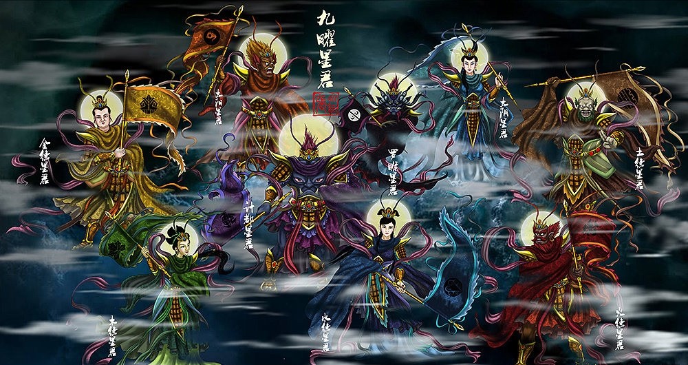 九曜:九曜同样是天庭星官的组合,有两种组合,其一是太阳星君、太阴星君、水德星君、火德星君、木德星君、金德星君、土德星君、计都星君和罗睺星君。其二为贪狼星君、巨门星君、禄存星君、廉贞星君、文曲星君、武曲星君、破军星君和两位辅星左辅洞明星君和右弼隐元星君。