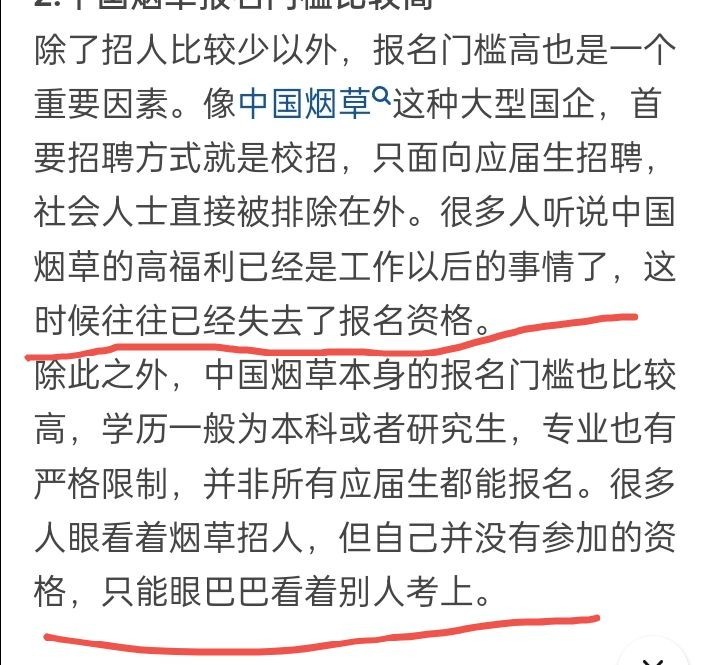 但烟草招人比较少,除此之外,报名门槛高也是一个需要关注的重要因素。像中国烟草这种大型国企,首要招聘方式就是校招,只面向应届生招聘,学历一般为本科或者研究生,专业也有严格限制,社会人士直接被排除在外。很多人听说中国烟草的高福利已经是工作以后的事情了,这时候就往往已经失去了报名资格。