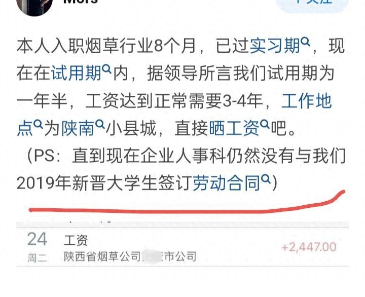 本人入职烟草行业已经8个月了,已过实习期,现在正在试用期内,据领导所言我们试用期为一年半,工资达到正常需要3-4年,工作地点为陕南小县城,直接晒工资吧——2447元!