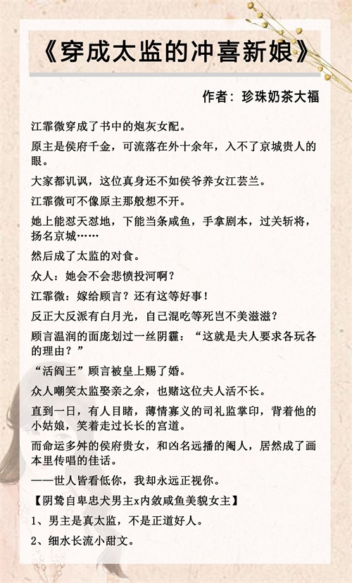 短评:穿书,古言,冲喜,真太监,真千金。女主是小说中的炮灰女配,死后转世到现代,在现代临死前看到原小说,再次穿回前世。女主本是侯府嫡长女,母亲身怀六甲离京避难,因生得貌美被县令看上,女主母亲抵死不从,县令怕女主母亲告状小命不保,于是将女主母亲毒哑打断双手囚禁在院子里。女主不知自己的真实身份,长大后被县令的正室夫人献给太监,后卖给老鳏夫,再被转卖给商人,最后才得以认祖归宗。