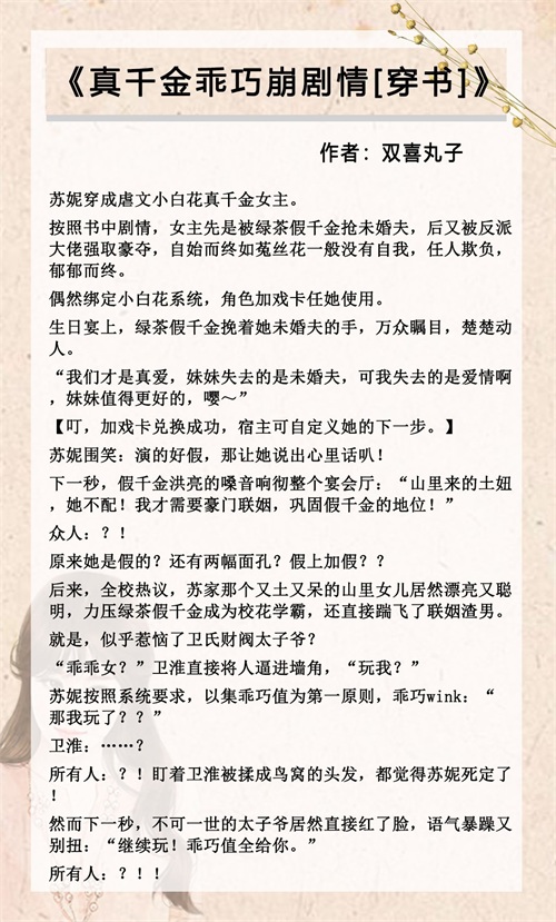 短评:穿书,校园,系统,真假千金。女主穿成了豪门狗血虐文中被虐身虐心的小白花原女主,原主性子软,习惯于讨好般的委曲求全,出身豪门却流落乡野山村,回到亲生父母身边后,被绿茶假千金百般针对,还被她毁了容,进而被亲生父母厌弃,连联姻对象也被抢走了,更惨的是还被反派男主强取豪夺,最后郁郁而终。