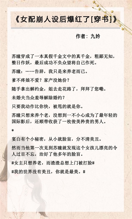 短评:穿书,真假千金,娱乐圈,爽文,事业为主,感情为辅。女主是快穿者,完成终极任务后获得了回原世界的权利,在时空隧道内受到原主怨气的攻击,女主退休不成反穿书,被扯入原主的体内。为了补偿女主,系统给了女主一些道具,允许女主可以不维持原主人设不走剧情。女主气场两米八,干脆利落地虐渣逆袭,在这期间遇到了只不对她脸盲的男主。