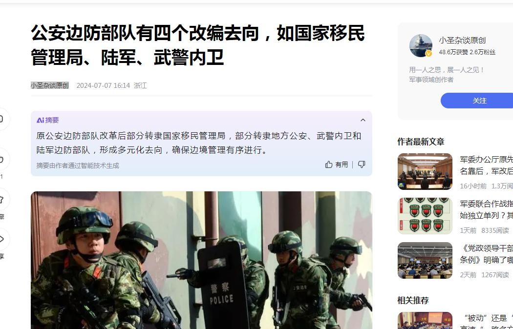 小圣杂谈原创,公安边防部队有四个改编去向,如国家移民管理局、陆军、武警内卫
