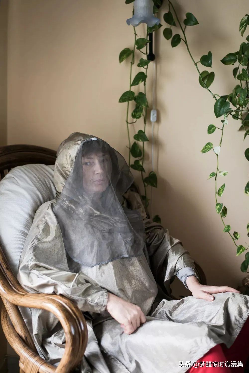 ▲53岁的艾瑞卡,出门必穿电磁防护服。她表示每次天线开始工作,自己的腹部就会疼痛、僵硬,有时候还会全身颤抖。为了防止微电流穿透身体,必须用含银和铜的毯子包裹自己。