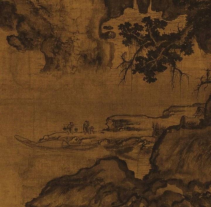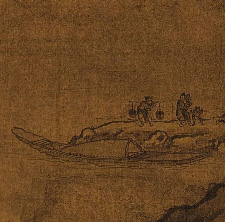 在《林泉高致》一书中,郭熙还提到“山得水而活,水得山而媚”。画中出现的大面积水域有三处,分别在画面左上方以及下方左、右;此外还有多处泉瀑。画面下方左右两边各有一湖泊,皆有渔人停舟登岸。左边有一妇人怀抱婴儿,手牵着一个黄发垂髫的小童,妇人回首望着身后挑担的男子,而童子则似乎被前方欢脱的黑色小狗所吸引而趋步向前,一幅春游欢愉的还家场景。画面右边则是两个正准备登岸的男子,左边的男子手中拄着竹篙,抬头好似凝望着眼前的高山,这便是“自山下而仰山巅”的“高远”;右边的男子则低头摆弄渔网,船上依稀可辨鱼篓等物,春江水暖渔人先知。