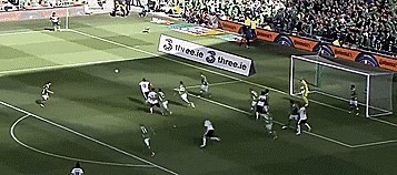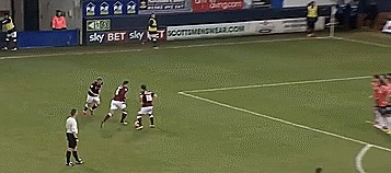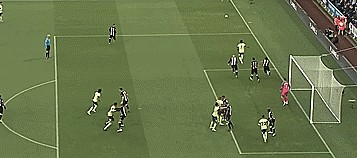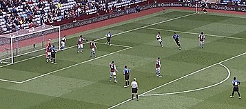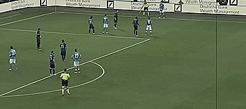 首先跑向罚球队员,然后直接做球给罚球队友,队员再传到门前,在这种情况下,威尔逊获得一个无人盯防的射门机会。