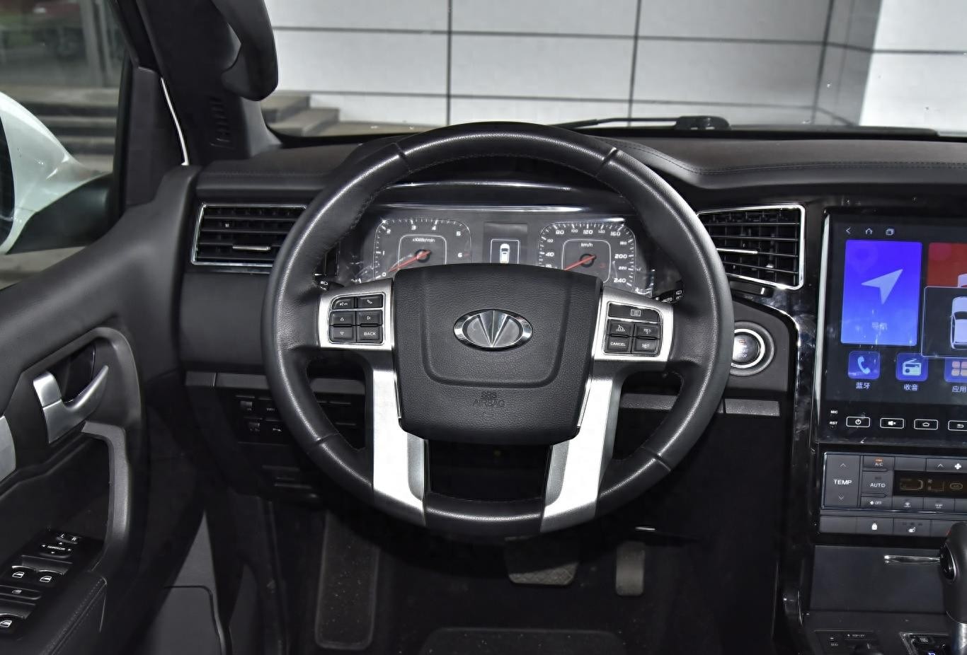 方向盘的尺寸不小,采用了皮质包裹,在方向盘一侧的A柱上还有拉手,这也是不少硬派SUV常见的配置。