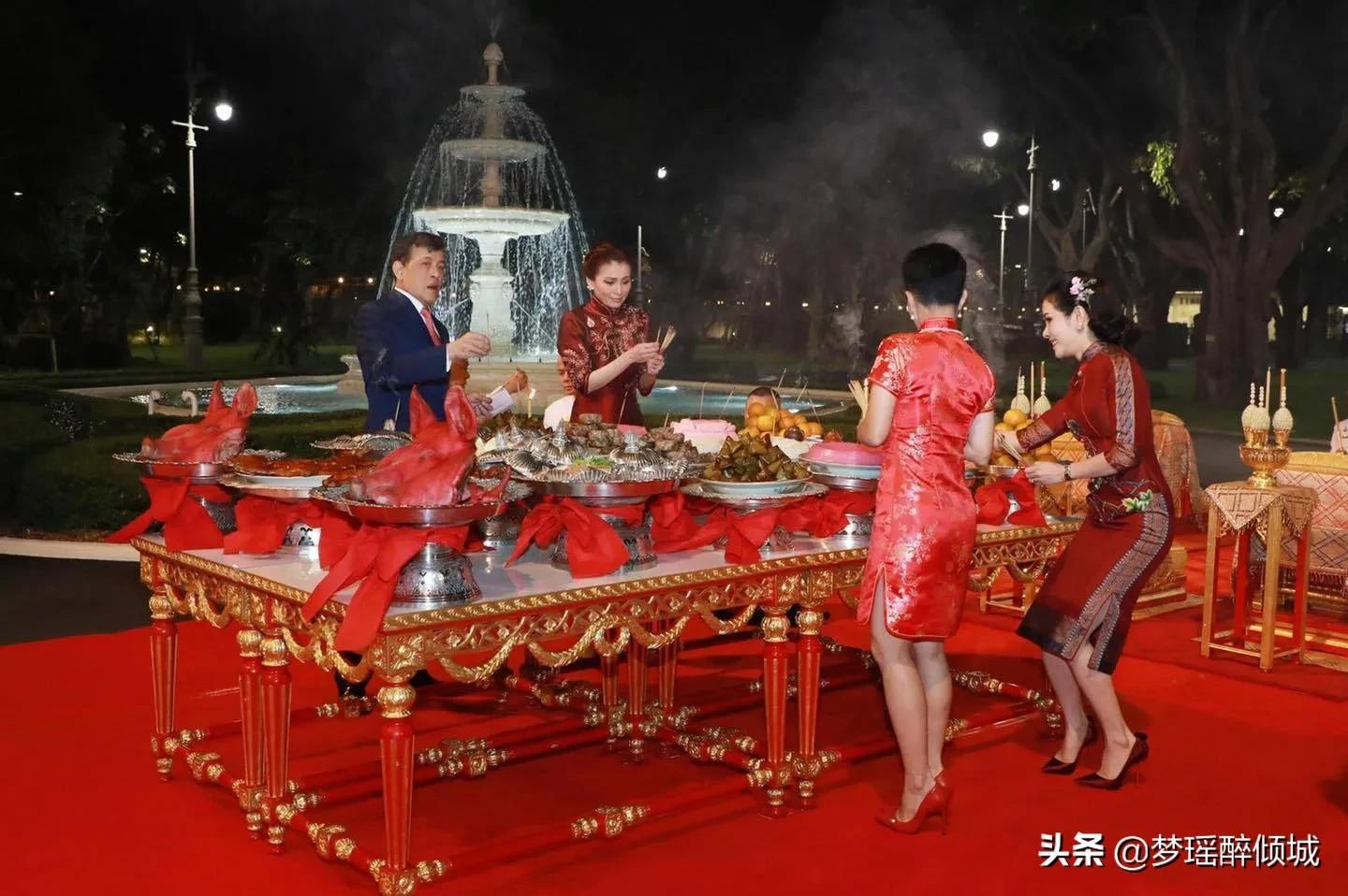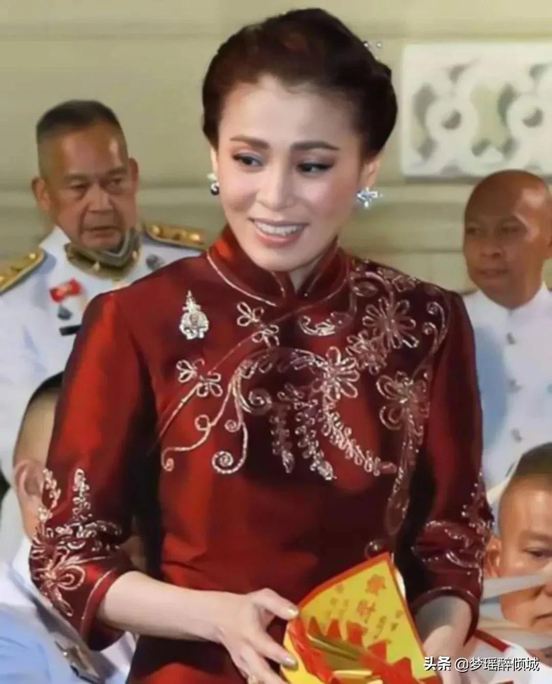 单独看一下泰王大女儿帕公主的旗袍造型和苏提达王后相比了,她的这件短袖旗袍,款式比较普通,有些某宝的感觉,大红色的旗袍,配上金丝刺绣,确实很有春节的氛围感,但是帕公主的气质不如苏提达王后,有着中国血统的苏提达,自带古典气质,能够轻松凸显出旗袍的美感来。