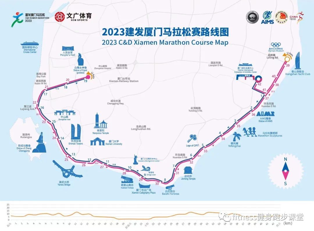 2023赛事路线:厦门国际会展中心(起点)→会展路→会展南路→环岛东路→环岛南路→演武大桥→鹭江道→湖滨南路(折返)→鹭江道→演武大桥→环岛南路→环岛东路(折返)→会展南路→会展路→厦门国际会展中心(终点)。