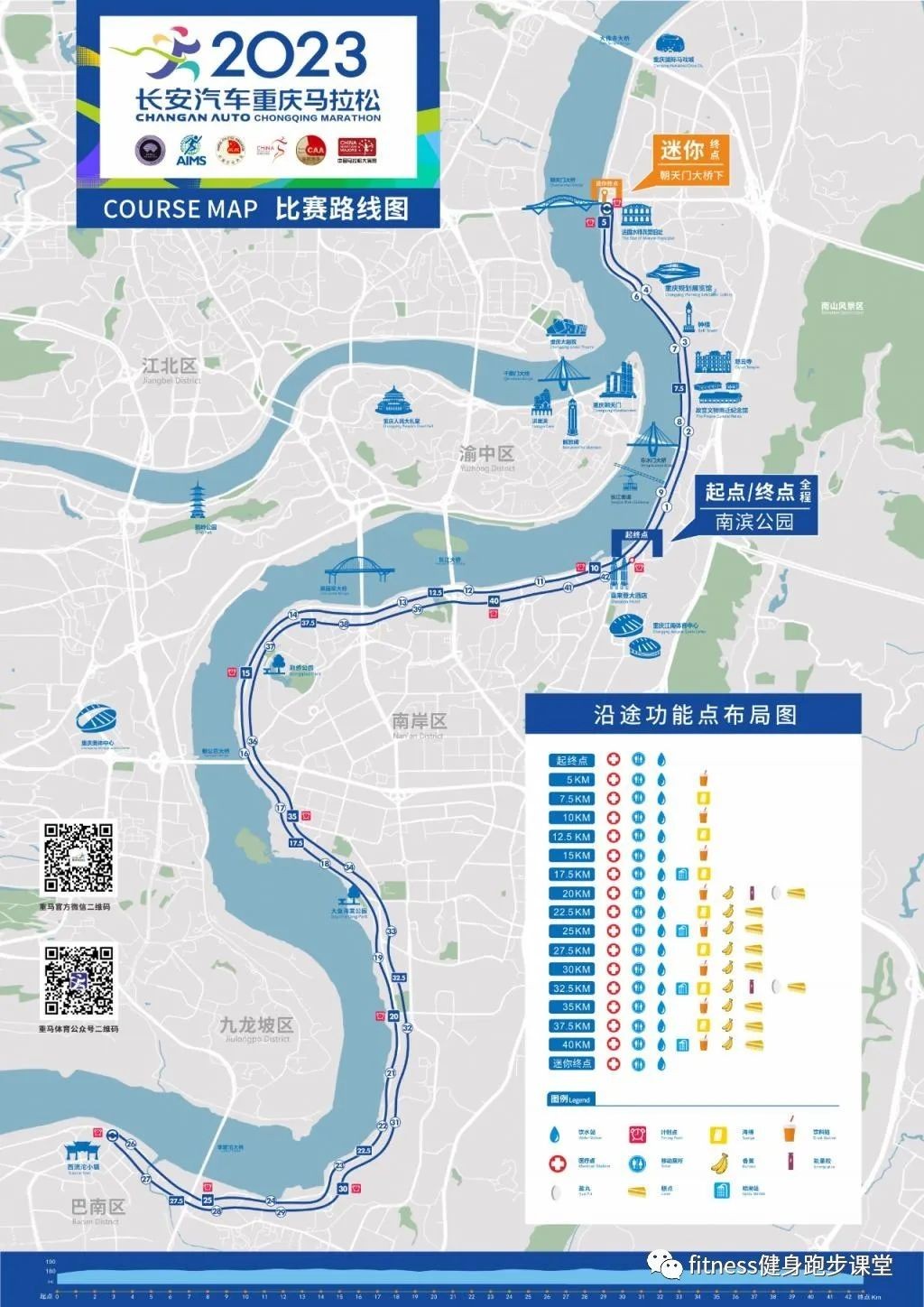 2023比赛路线:重庆南滨公园门口起跑——朝天门大桥下(折返)——重庆南滨公园门口——长江大桥下——菜园坝大桥下——鹅公岩大桥下——美堤雅城路口——李家沱大桥下——融汇小区路口(折返)——李家沱大桥下——美堤雅城路口——鹅公岩大桥下——菜园坝大桥下——长江大桥下——重庆南滨公园门口(终点)。