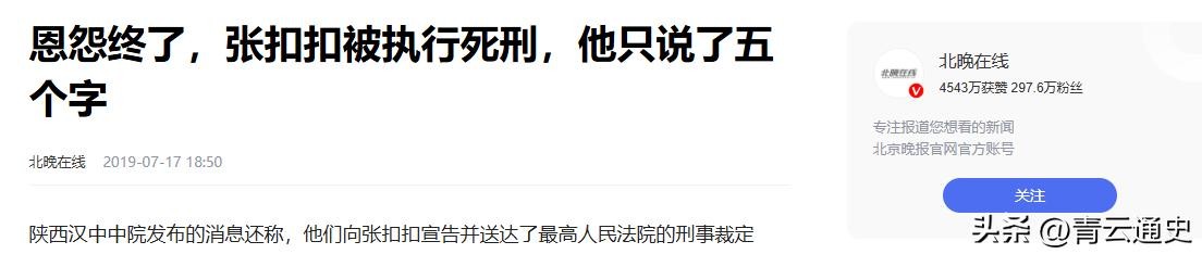 信息来源:2019年7月17日发表于北晚在线——《恩怨终了,张扣扣被执行死刑,他只说了五个字》