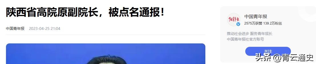 信息来源:2023年4月25日发表于中国青年报——《陕西省高院原副院长,被点名通报!》